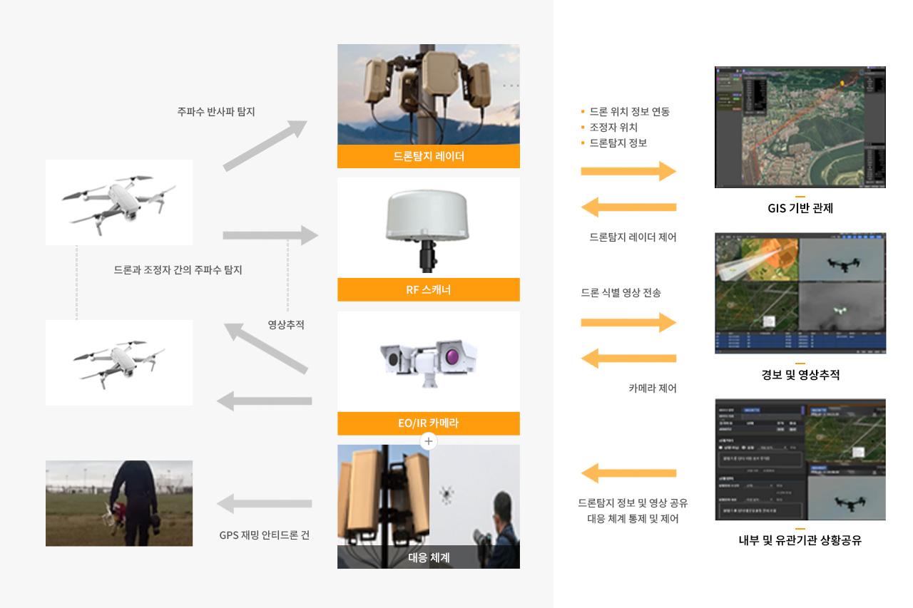 드론 탐지 레이더 및 EO/IR 카메라, RF 스캐너, 대응 장비등과 연계하여 불법 드론의 침입을 사전에 탐지하고 즉각적 대응이 가능한 솔루션 입니다.